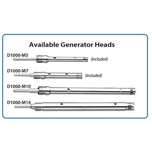 Đầu dò máy phát điện có bốn kích cỡ. Đầu dò đường kính 5mm và 7mm có chiều dài 50mm, phù hợp để sử dụng với mẫu trong ống nghiệm microtube. Đầu dò 10mm x 115mm lý tưởng để sử dụng với ống nghiệm 15ml và 50ml, còn đầu dò 14mm x 130mm phù hợp để sử dụng với ống nghiệm 50ml và bình chứa lên đến 250ml. Thiết bị được cung cấp kèm theo một đầu dò phát điện 5mm và 7mm.