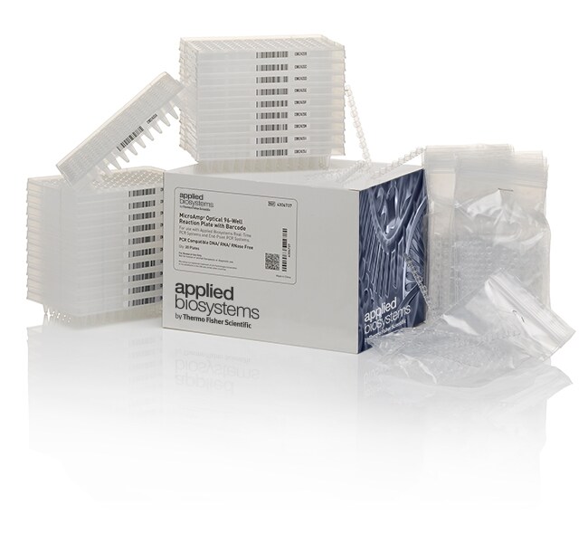 Đĩa phản ứng MicroAmp™ Optical 96 giếng kèm mã vạch và nắp quang học của Applied Biosystems™ được tối ưu hóa để cung cấp độ chính xác và đồng nhất nhiệt vượt trội cho quá trình khuếch đại PCR nhanh và hiệu quả. Đĩa này được chế tạo từ một mảnh polypropylene cứng duy nhất với định dạng 96 giếng, tương thích với hệ thống Real-Time PCR 96 giếng của Applied Biosystems™ và các thermal cycler.